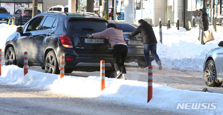 속초, 오르막길 미끄러지는 자동차들