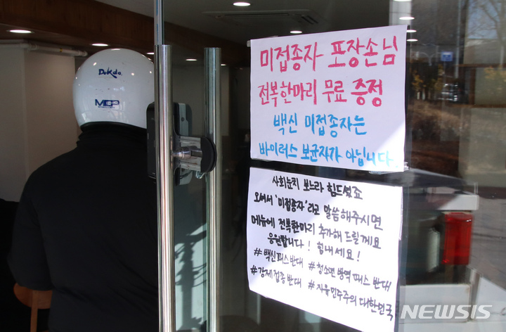 '백신 미접종자 힘내세요' 메세지 내건 식당