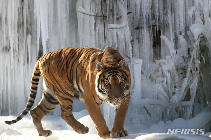 빙벽 앞 걷는 호랑이