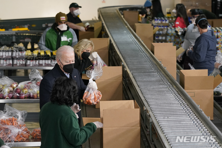 '식품 포장' 자원봉사하는 바이든 대통령 부부