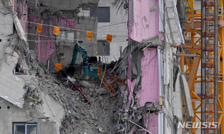 '잔해물 낙하'로 수색 작업 중단된 붕괴 현장