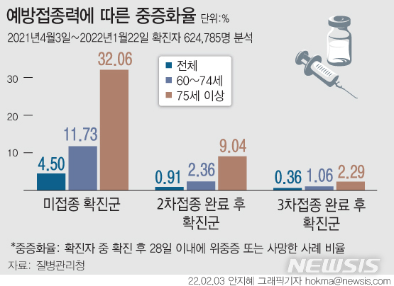 [그래픽] 3차접종시 미접종자보다 중증위험 92% 낮아