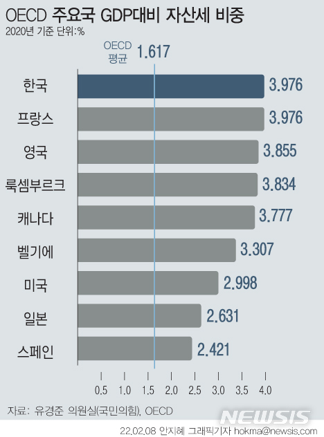 [그래픽] OECD 주요국 GDP대비 자산세 비중