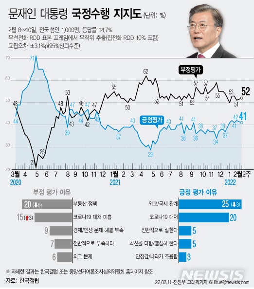 [그래픽] 文대통령 지지율 41%…부정평가 52% (갤럽)