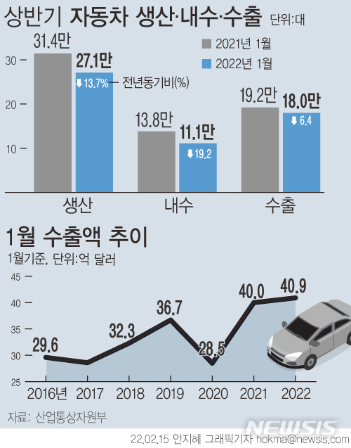 [그래픽] 1월 자동차 생산·수출·판매 동반 감소