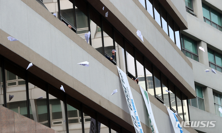 종이비행기 날리는 CJ대한통운 점거농성 택배노조원들