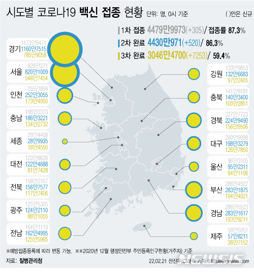 [그래픽] 시도별 코로나19 백신 접종…3차 경기 785.9만, 서울 548.7만명