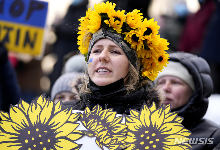 우크라이나 국화 해바라기 꽂은 캐나다 시위 여성