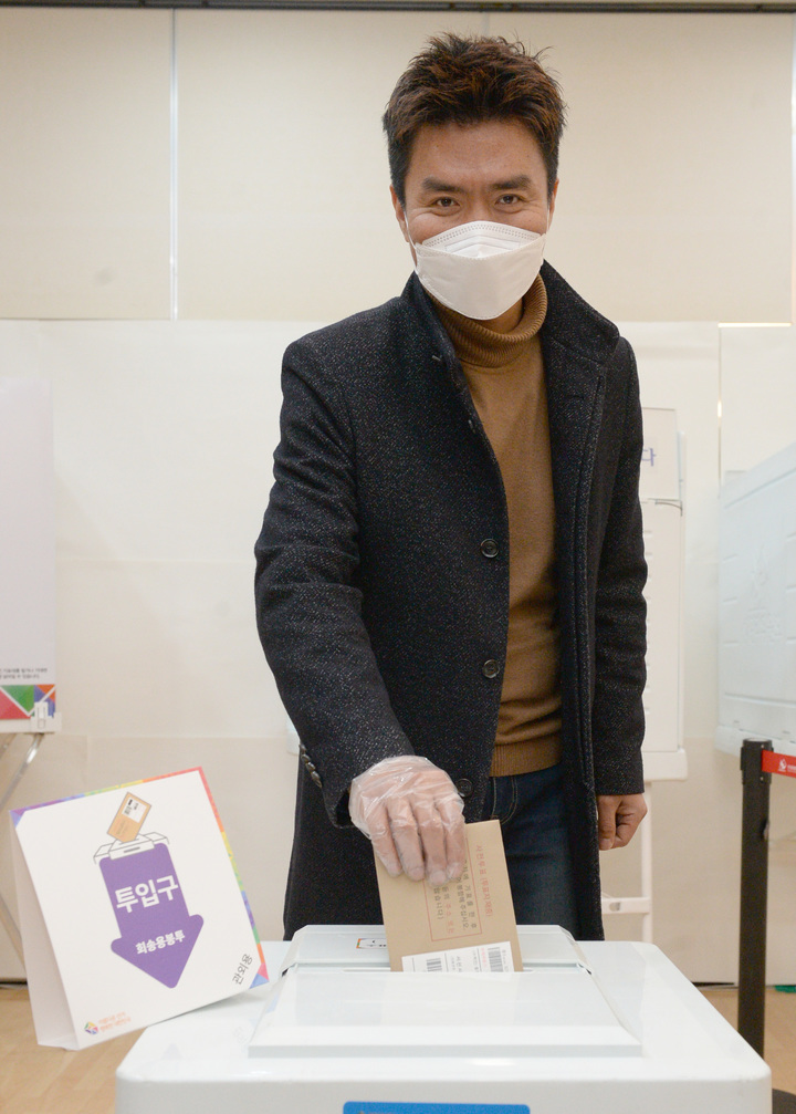 사전투표 마치고 나오는 가수 양은지