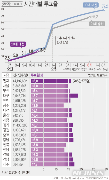 [그래픽] 20대 대선 투표율 오전 11시 현재 16.0%…19대보다 3.4%p 낮아