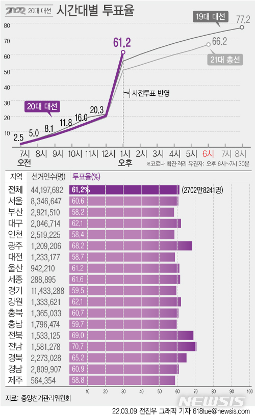 [그래픽] 대선투표율 '사전투표 반영' 오후 1시 61.2%…19대 대비 5.7%p 높아