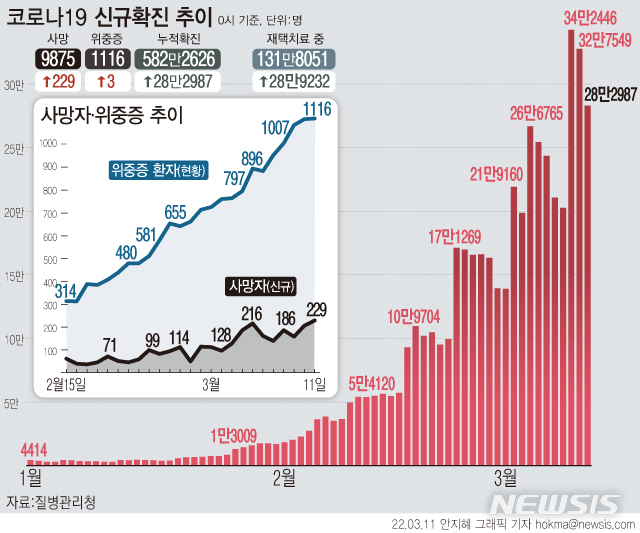 [그래픽] 코로나 신규확진, 사흘만에 30만명 미만…사망 '역대 최다'