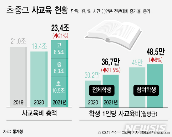 [그래픽] 작년 학생 1인당 사교육비 36만7000원…21.5%↑ '역대 최대'