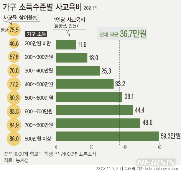 [그래픽] 월 소득 800만 이상 사교육비 59.3만원…저소득층의 5.1배