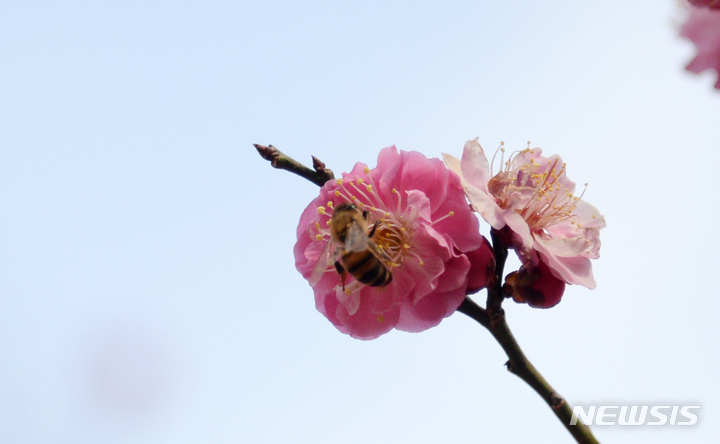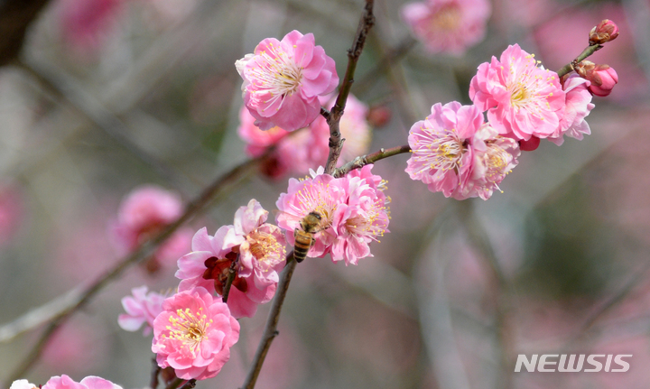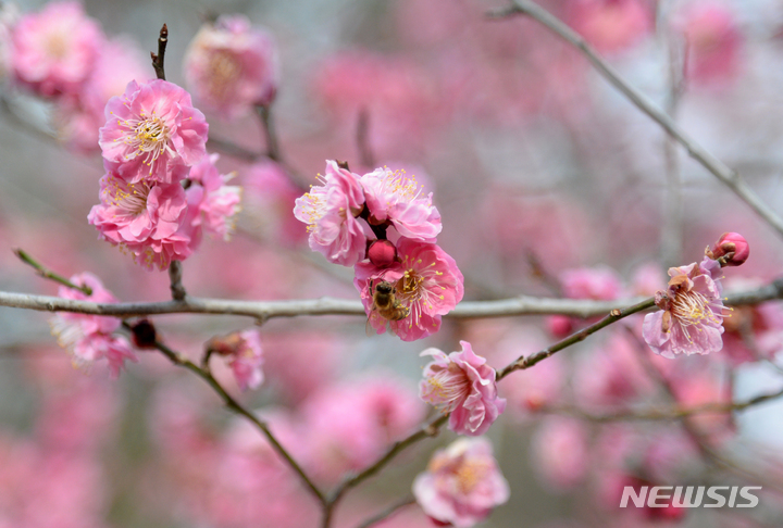 '봄 날씨에 만개한 홍매화 찾은 꿀벌'