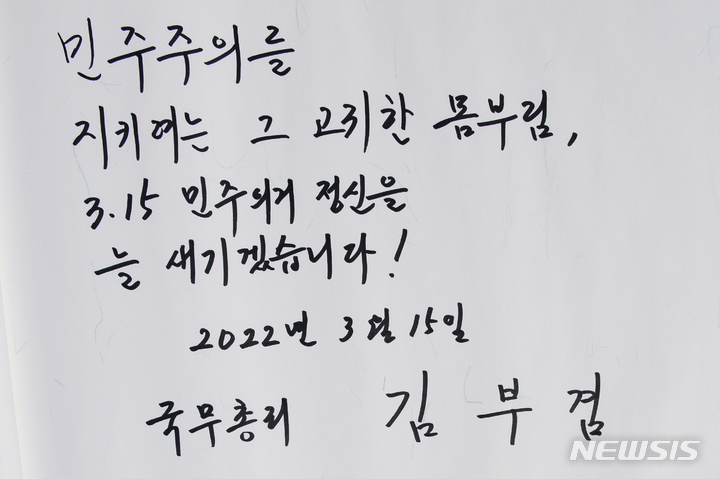 3.15민주묘지에서 남긴 김부겸 총리의 방명록