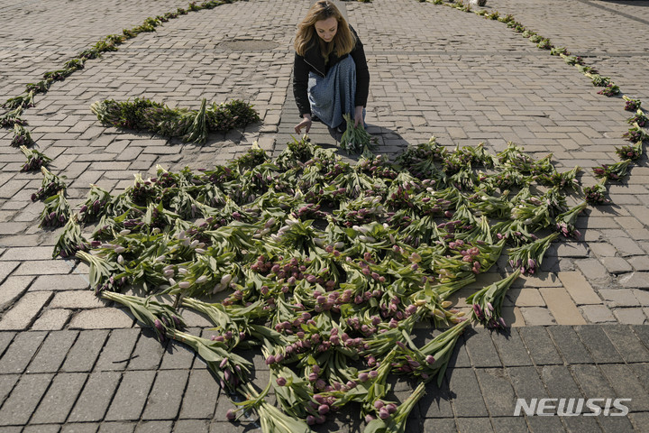키이우 시민들, 튤립으로 우크라이나 상징 만들기