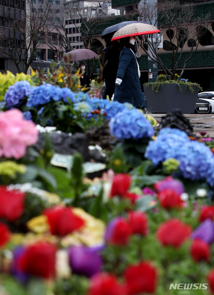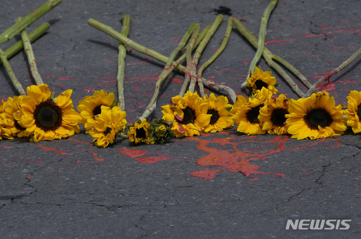 러시아 대사관 앞 놓인 우크라이나 국화 해바라기