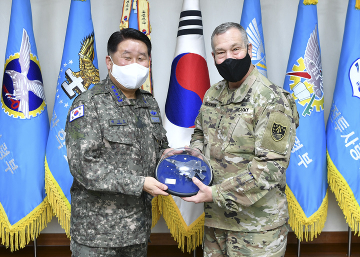 美우주사령관에게 KF-21 모형 전달하는 박인호 공참총장