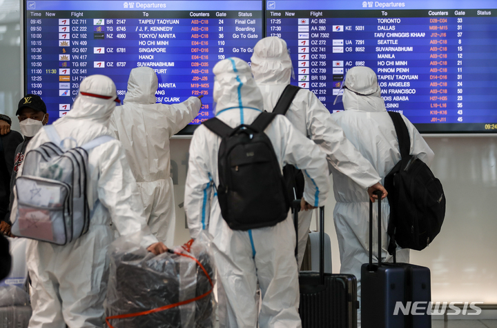 방호복으로 무장한 공항이용객