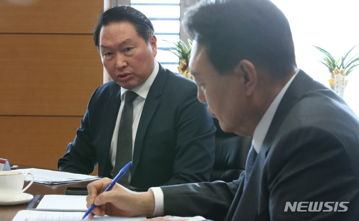 최태원 대한상의 회장 발언 메모하는 윤석열 당선인