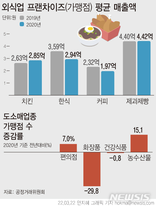 [그래픽] 프랜차이즈 평균 매출 5.5% 하락…'치킨'은 8.4%↑