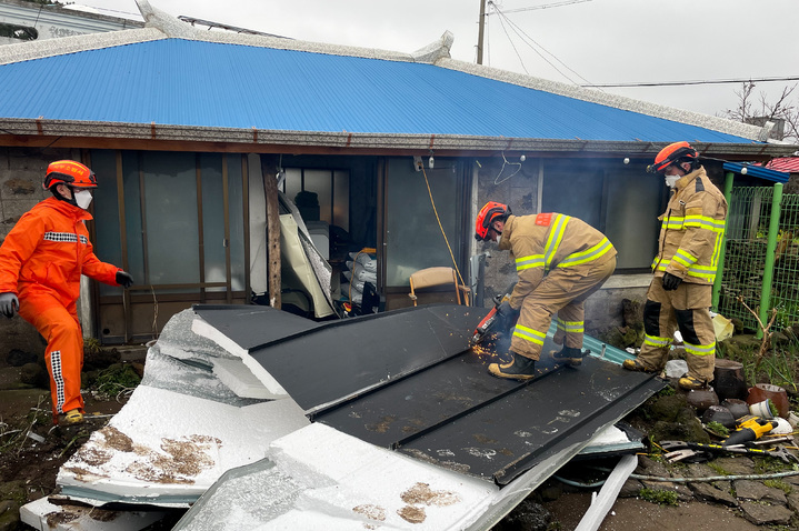 강풍에 날아간 지붕 구조물