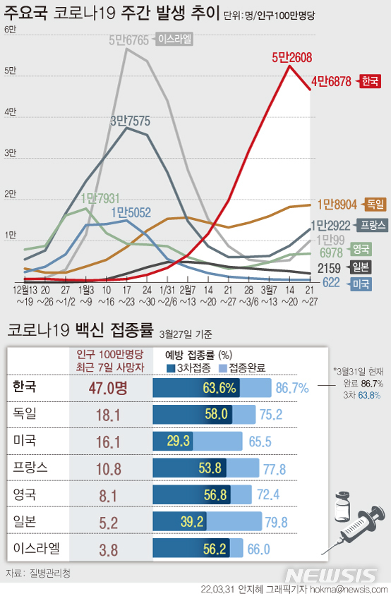 [그래픽] 주요국 코로나19 주간 발생 추이