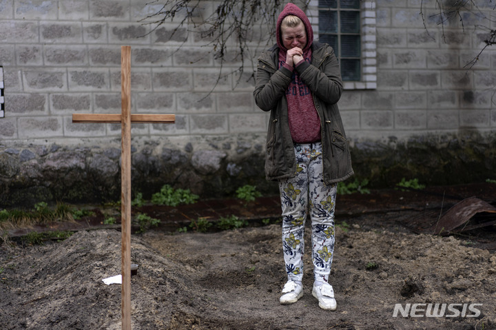 러시아 공격에 희생된 부친 묘에서 흐느끼는 여성