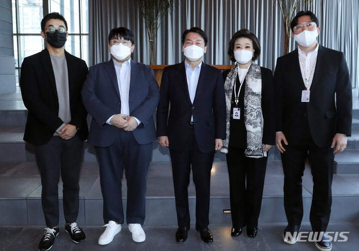 기념촬영하는 안철수-방시혁-박지원