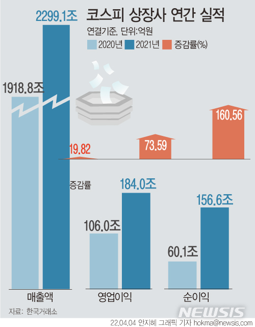 [그래픽] 코스피 상장사, 작년 매출액 2299조 '역대 최대'