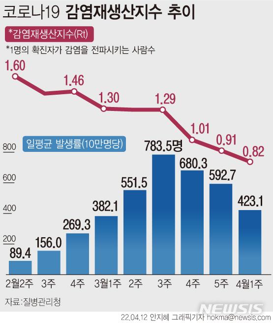 [그래픽] 코로나19 감염재생산지수 추이…2주 째 1.0 아래