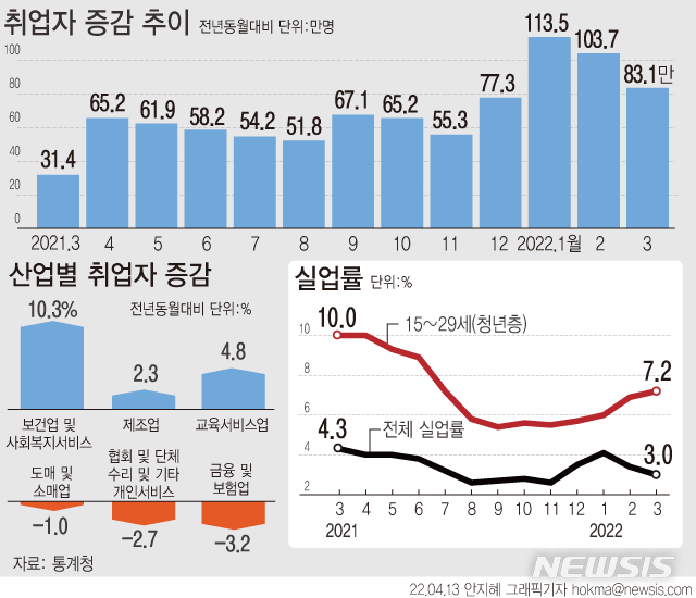 [그래픽] 3월 취업자 83.1만명 증가…오미크론 영향 증가폭은 둔화