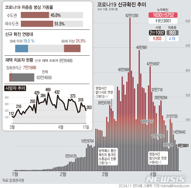 [그래픽] 코로나 신규 확진, 엿새만에 10만명 아래로…사망 203명 늘어