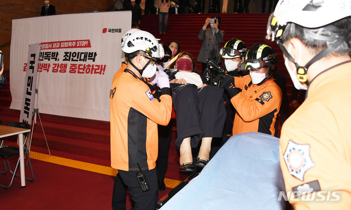 국민의힘 항의 속 이동하는 박병석 국회의장