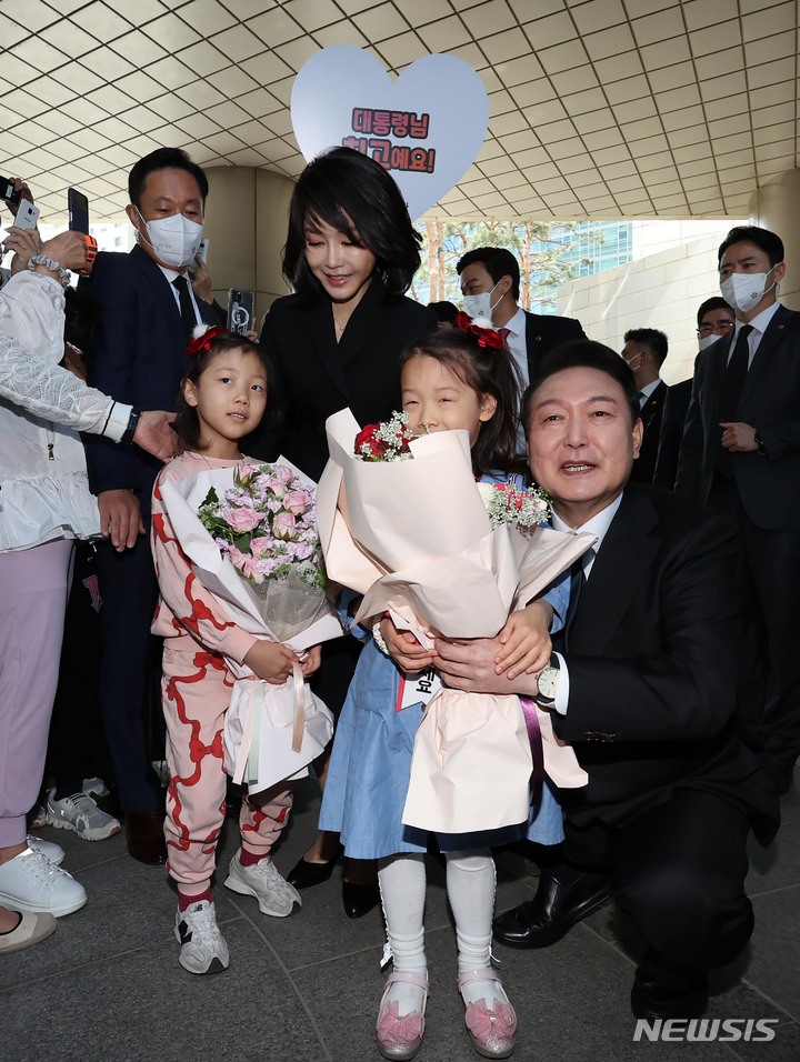 화동과 기념촬영하는 윤석열 대통령-김건희 여사