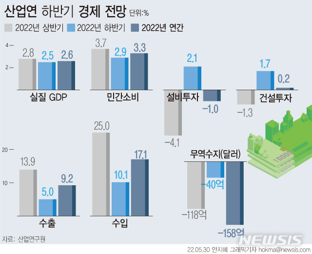[그래픽] 산업硏, 올해 성장률 2.6%로 하향…무역적자 -158억 달러