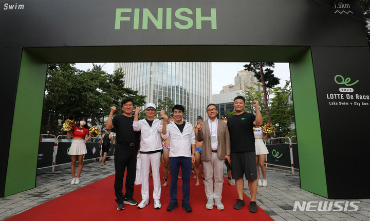 출발 전 기념촬영하는 서강석 송파구청장과 류제돈 롯데물산 대표