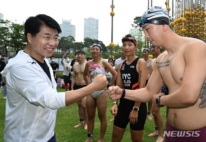 레이스 참가자들과 인사하는 서강석 송파구청장