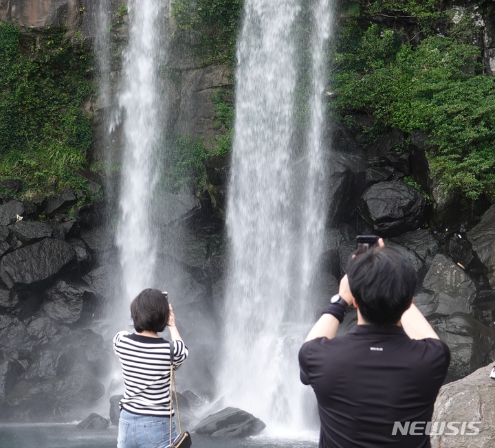 제주 정방폭포 인증샷 남기는 관광객들