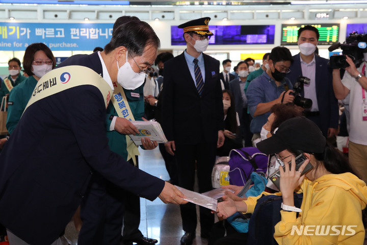 귀성객들에게 마스크 나눠주는 한덕수 국무총리