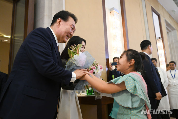 '인도 동포 초청 만찬 간담회' 화동에게 꽃다발 받는 윤 대통령 부부