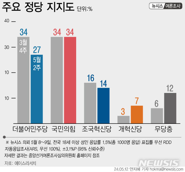 [그래픽] 정당지지율, 국민의힘 34%·민주 27%·조국신당 14%