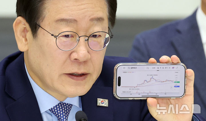 주식그래프 띄우며 발언하는 이재명 대표