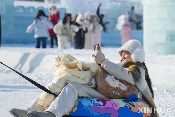 기념 사진 찍는 하얼빈 빙설제 관광객