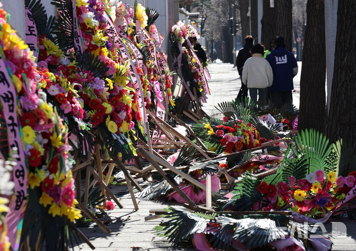 한덕수 권한대행 응원 화환 쓰러진 채 방치, 시민 통행 불편