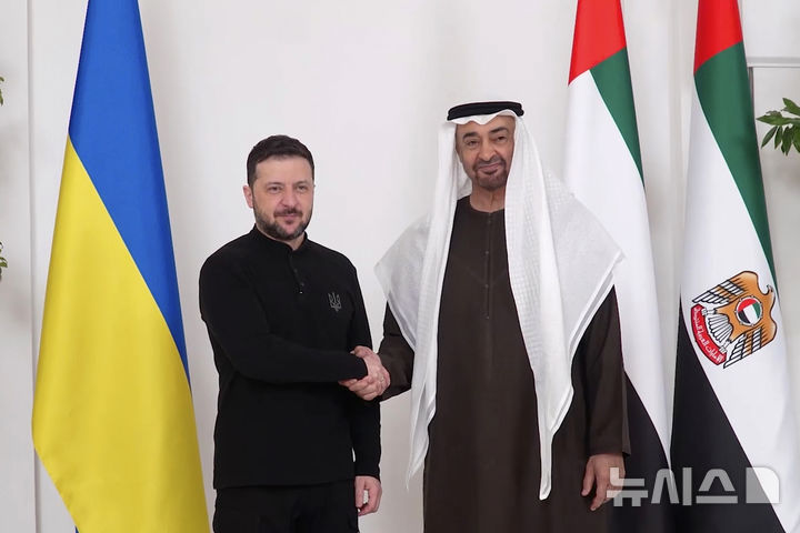 UAE 대통령과 회담 중 악수하는 젤렌스키 대통령