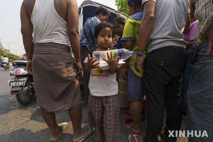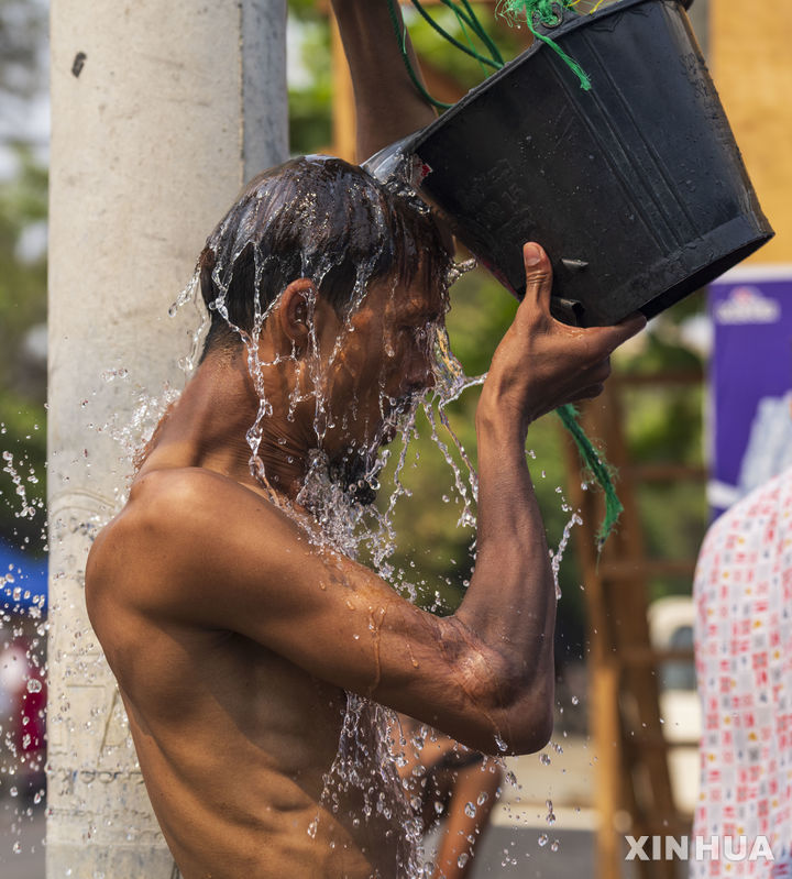 양동이 물로 더위 식히는 미얀마 이재민