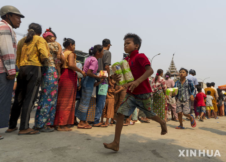 구호 음식 받는 미얀마 이재민 어린이들
