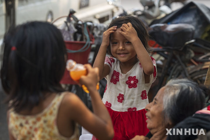 대피소에서 더위 식히는 미얀마 어린이